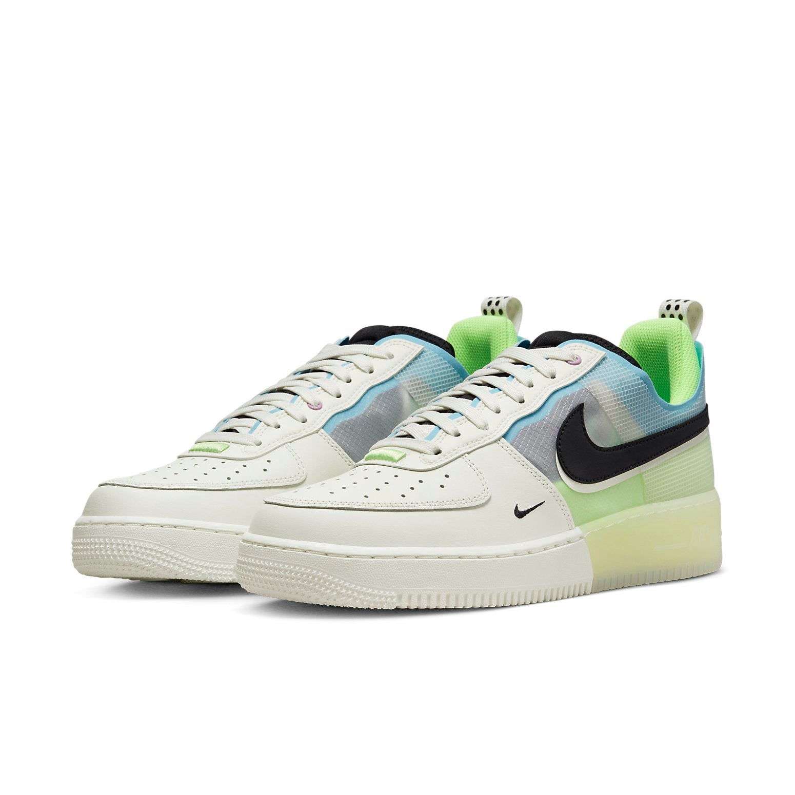 The NK Air Force 1 React 'Sail Barely Volt' is the perfect combination of style and comfort. Crafted with a blend of leather and mesh, this sneaker features a transparent TPU overlay at the heel and an embroidered branding. The React foam midsole is embedded with a two-tone rubber and semi-translucent outsole. This sleek silhouette is perfect for everyday wear and is sure to make a statement. Inspired by the original Air Force 1, this shoe is part of the React series, combining classic style with modern technology.