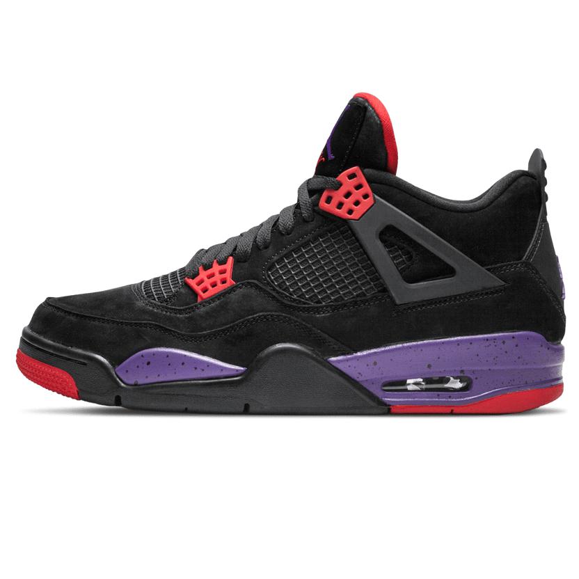 In 2018 Jordan Brand took the original black, purple, and red palette from the Air Jordan 7 and used it to create the Air Jordan 4 "Raptors." The fierce colorway was rumored to be designed by Drake, drawing inspiration from his beloved Toronto Raptors. The Air Jordan 4 "Raptors" has a premium black suede construction with a purple speckled midsole and bright red accents.