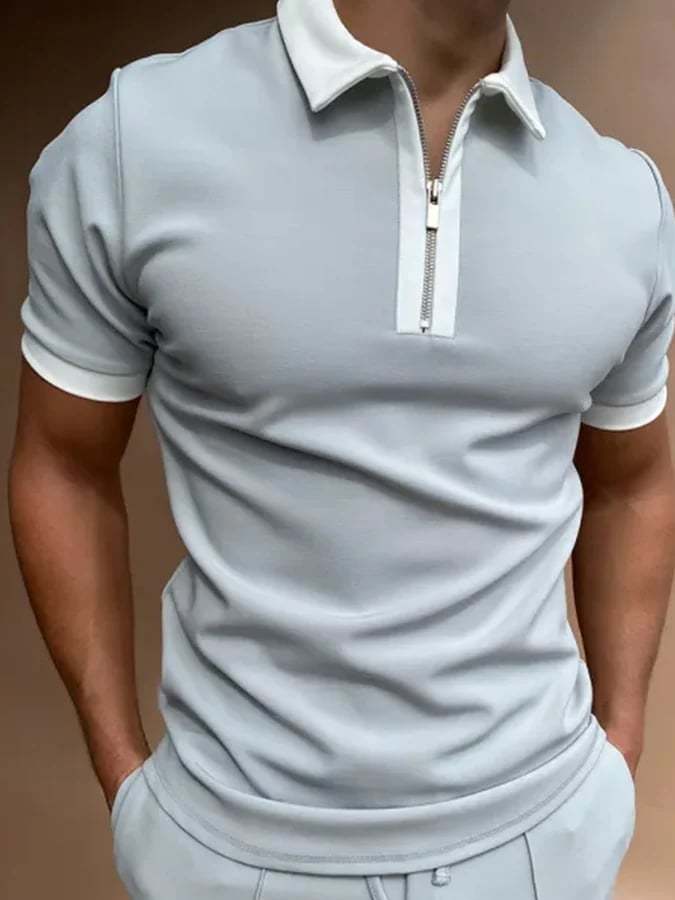 Men's Lapel Zipper Short Sleeve Color Matching Casual POLO Shirt