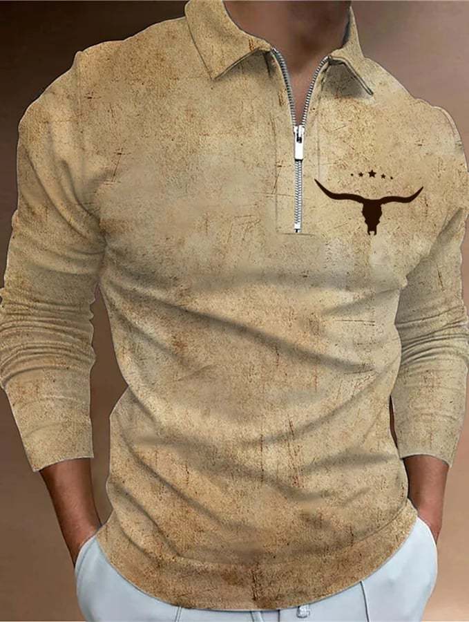 Men's Retro Western Print Casual Long Sleeve Polo Shirt