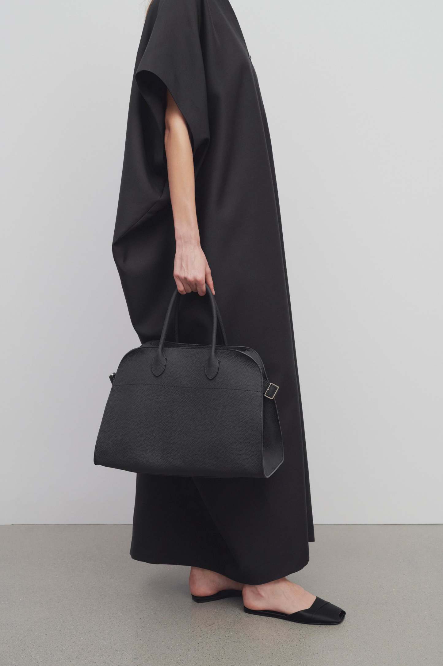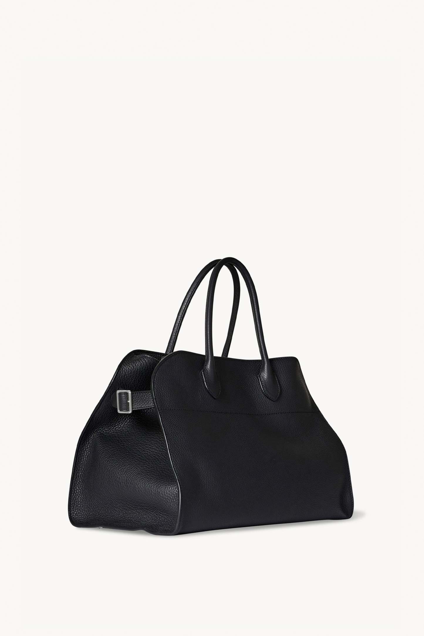 マットなグレイン仕上げのカーフスキン製のソフトな構造のトップハンドル付きのバッグで、ベルト付きのマチのあるサイドパネル、内側のトグル開閉が特徴です。